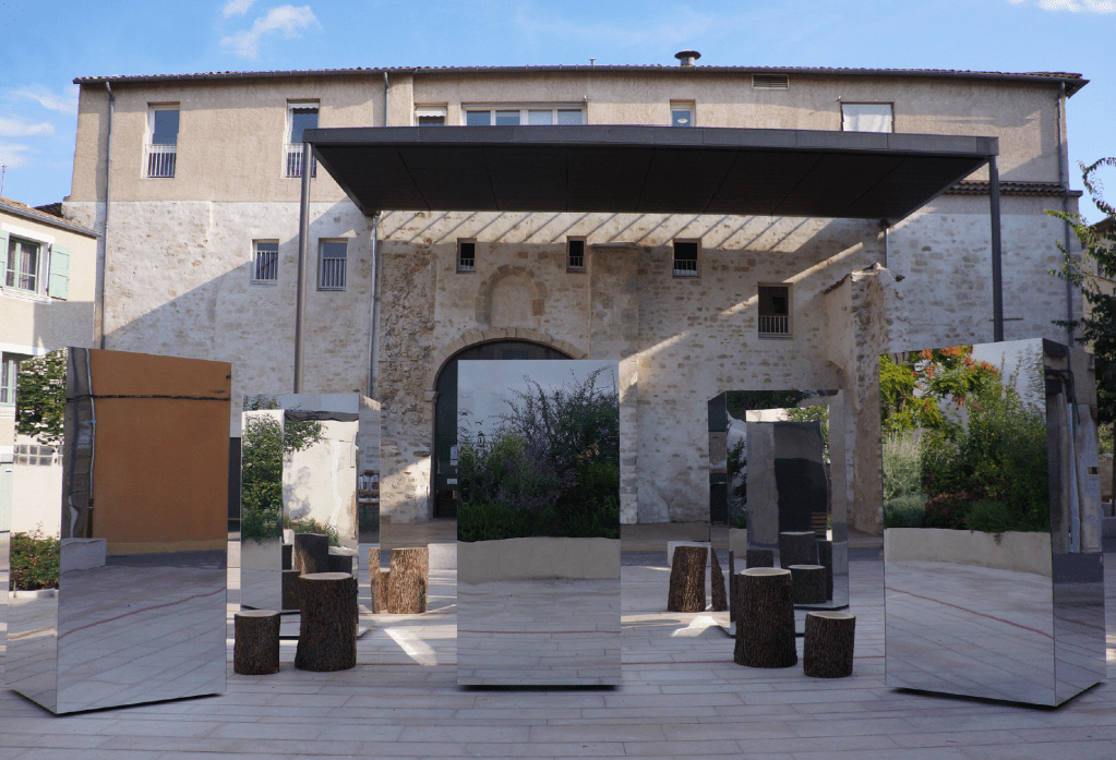 L’Ecritoire à Vertiges est une œuvre immersive qui invite le public à vivre une expérience poétique, dans un jeu de reflets et de perceptions où se croisent les vertiges de la mise en abîme et ceux de l’écriture. L’installation est composée de colonnes rectangulaires en miroirs et de rondins de bois plaçant la nature au centre de l’œuvre. Les visiteurs peuvent déambuler de manière contemplative et se poser pour écrire…